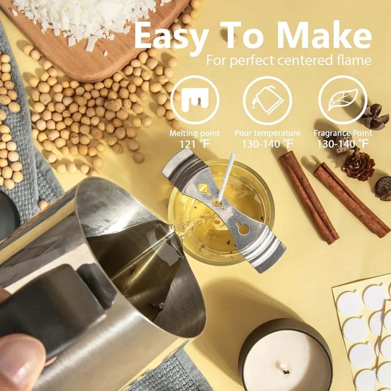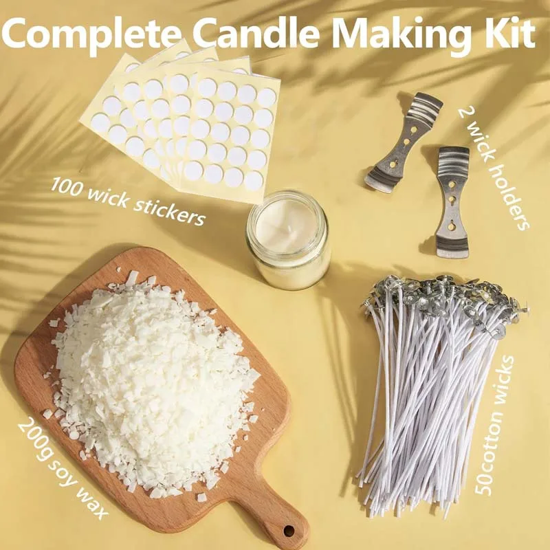 Create beautiful, clean-burning candles at home with this all-in-one soy candle making kit. Featuring 200g of natural soy wax flakes, this kit provides a smooth, eco-friendly base that melts easily and delivers a long-lasting, even burn. It includes 50 cotton candle wicks for reliable performance, 100 wick stickers to keep each wick securely in place, and 2 centering devices to ensure perfect alignment while your candles set. Designed for convenience and precision, this kit is ideal for beginners learning the craft as well as experienced makers looking for a reliable supply set. Perfect for DIY projects, home décor, or personalized gifts, it makes candle making simple, enjoyable, and professional.